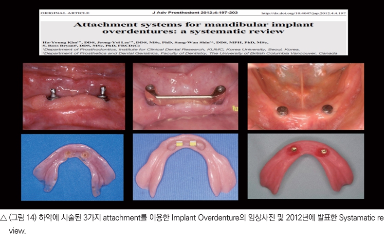 2012년 고려대학교 임상치의학연구소에서 하악의 Implant overdenture에 응용되는 Attachment의 종류에 따른 환자들의 만족도에 관한 systematic review를 하여 논문을 발표하였다(그림 14).