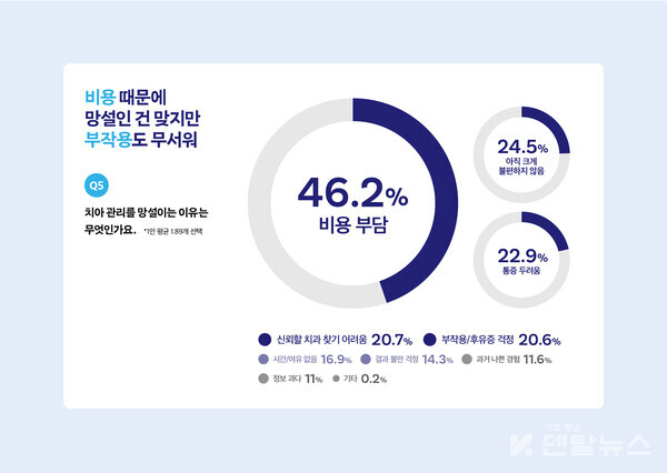 리포트에 따르면 응답자 10명 중 7명(70.3%)이 치아 때문에 부정적 행동을 한 경험이 있다고 답했다. 웃거나 말할 때 손으로 입을 가린 적 있다는 응답이 35.5%로 가장 많았고 무표정하게 사진이나 영상을 찍었다(21.5%), 외모 평가를 받을까봐 위축된 적이 있다(20.9%)는 답변이 뒤를 이었다. 반면 통증(12.8%)이나 발음 문제(7.4%) 같은 기능적 이유는 상대적으로 낮았다.