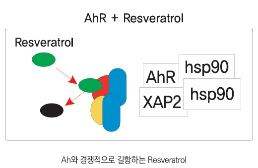 Resveratrol은 AhR이 TCDD와 결합하지 못하도록 하는 Ah 길항제이다. 일단 AhR과 결합한 Ah는 resveratrol에 의하여 AhR에서 유리되고 대신 resveratrol로 대체됨으로써 AhR 리갠드의 형성이 차단된다. 이 작용은 경쟁적이며 AhR과의 친 화성은 resveratrol이 Ah보다 훨씬 크다. 결과적으로 resveratrol은 AhR에서 Ah의 결합을 대체하는 차단작용을 발휘, AhR에서 TCDD에 의한 AhR 리갠드 형성을 용량 의존적으로 억제하는 역할을 하는 것이다.