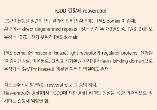 적포도주에서 발견되는 resveratrol도 그 중의 하나이다. AhR의 경우에는 인체 내의 표적기관인 리갠드 결합부위가 PAS-B내에 있다. 일종의 세균성 광활성(光活性)단백질인 PAS 단백질은 PAS-B내에 chromophore인 4-hydroxyl-cinnamoyl이 공유 결합한 상태이다.