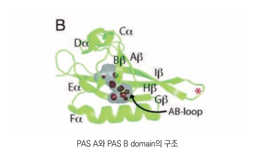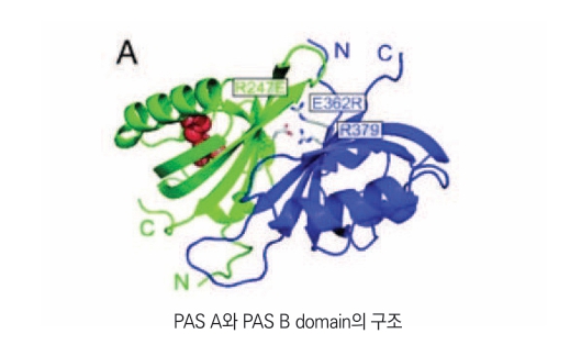그동안 진행된 일련의 연구결과에 의하면 AhR에는 PAS domain이 있으며 이는 일종의 화학감지 기능이 있는 것으로 간주되고 있다. PAS domain은 ~50~잔기의 direct degenerated repeats 두 개(PAS-A, PAS-B)를 보유하는 ~270~잔기부위이다. PAS domain은 histidine-kinase, light receptor와 regulator proteins, 산화환원 감지단백질, 이온통로, 그리고 산화환원 감지기나 flavin-binding domain으로 추정되는 Ser/Thr kinase를 포함한 여러 단백질에서 발견된다.