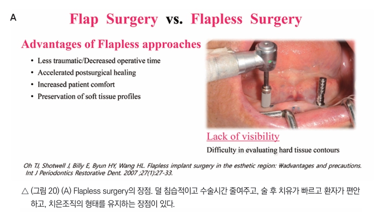 최근에는 SurgiGuide는 Fixture의 식립 위치, 깊이, 방향까지 잘 제어해주기 때문에 쉽게 Fixture간의 평행관계를 맞혀줄수 있는 장점이 있기는 하나 모든 증례에 SurgiGuide를 이용한 Flapless Surgery를 할 수 있는 것은 아니다.