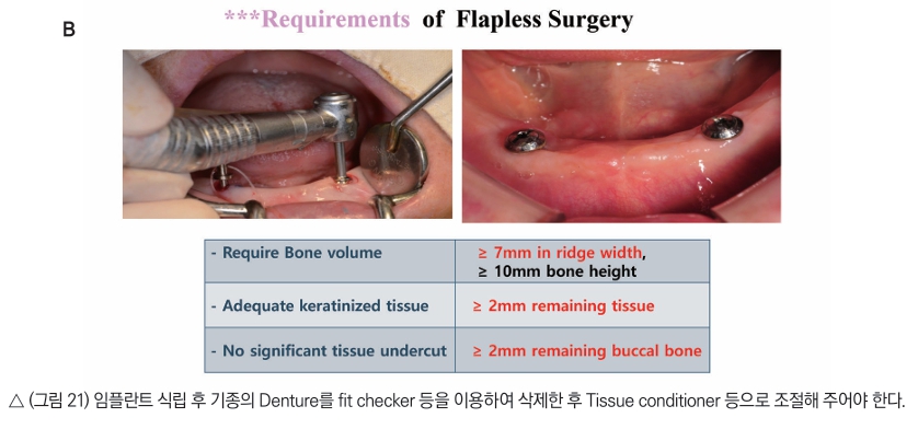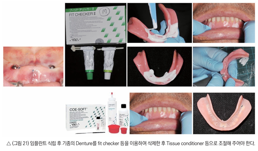 임플란트 식립 후 기종의 Denture를 fit checker 등을 이용하여 삭제한 후 Tissue conditioner 등으로 조절해 주어야 한다.(그림 21).