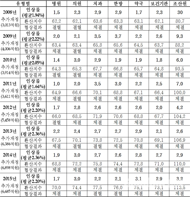 그 결과, 5개 단체와는 합의하고 병원과 치과는 공단이 제시한 최종 수치와의 간격을 좁히지 못해 결렬됐다.