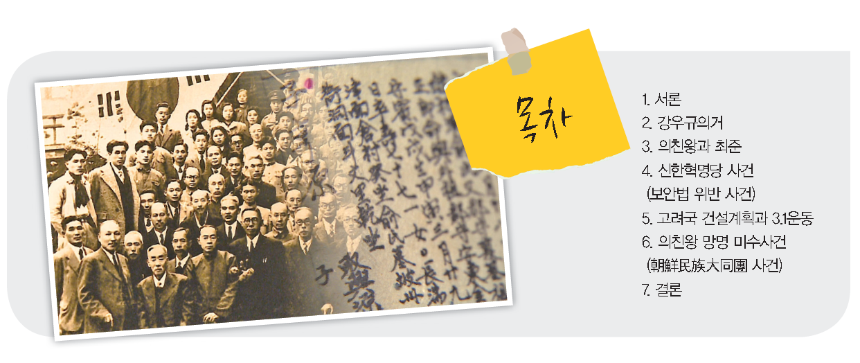 그러나 비봉에서 북한산 구기동 매표소까지는 1시간이면 내려갈 수 있다. 중간에 승가사가 있으며, 승가사도 독립운동에 역할을 하지 않았을까 추측된다. 세검정의 소림사도 연락처로서의 역할을 하였다. 진관사에서는 요즈음도 국행수륙대재를 지내는데, 국행수륙대재는 조선시대 나라의 안녕과 국민의 평안을 기원했던 불교식 천도의례였다. 진관사는 왕실의 사찰이었는데, 의친왕 망명미수사건에 직접 관여하였다. 1907년 의친왕이 북한산성에서 의병봉기를 독려하는 연설을 했다고 하는데 진관사도 연관되었을 가능성이 많다. 그리고 우이동의 봉황각도 위치는 다르지만 북한산 범주에 포함되어 있다. 2015년 1월27일 이문창9)은 해방직후에 아나키스트들의 집회로 진관사를 방문하기도 했다고 증언하였다. 8) 보천교주 차경석10)11)보천교는 1909년 차경석에 의해 창시되었다. 차경석은 동학농민군 지도자 차치구의 장남으로 강증산의 제자이다. 보천교는 종교적 근원을 증산교에 두고 있다.
