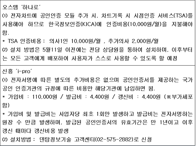 현재 치과의료기관에서 전자서명 기능이 업데이트된 전자차트는 오스템의 ‘하나로’와 신흥의 ‘i-pro’로, 소정의 사용료를 지불하면 전자서명이 가능하다. 업데이트 방법 및 비용은 아래 그림과 같다.