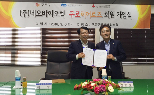 네오바이오텍(대표 허영구·김인호)이 지난 6일 사회공헌활동의 일환으로, 구로구 저소득층 지원 사업인‘구로 히어로즈’ 1호 기업으로 협약을 체결했다.