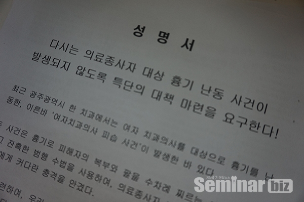 성명서는 최근 광주광역시 한 치과에서는 여자 치과의사를 대상으로 흉기를 난동한, 이른바 ‘여자치과의사 피습사건’에 대해 해당 법원 및 검찰에 해당 가해자를 일벌백계하라고 요구했다 .
