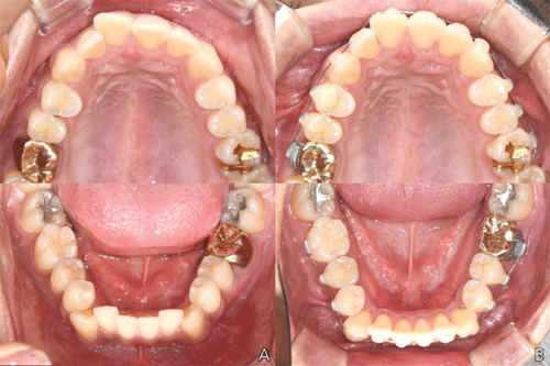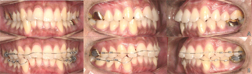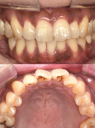 20대 남자 환자로 크라우딩을 주소로 내원하였습니다. 구순은 돌출되지않았고, 중등도의 크라우딩을 보이고 있습니다. 인접면 삭제(Interproximal reduction, IPR)로 공간을 확보하여 주소를 해결해주기로 계획하였습니다. 우측 견치는 반대교합 상태입니다.(A) 일주일 간격으로 상, 하악 공히 014나이타이를 접착하였습니다. 치료 시작 6주 후에는 아직 가장 크라우딩이 펴지지 않은 #12와 #43 부위의 와이어를 re-bonding하여 힘을 더 가하였습니다.(B)