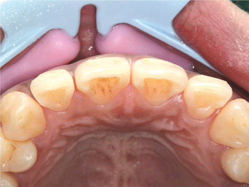 다고 생각합니다.(그림 51) 하지만 해부학적인 형태가 그대로 잘 유지되도록 치간 삭제를 하는 것은 매우 어려운 일입니다.(그림 52) 정확하게 그리고 해부학적인 형태를 유지하면서 치간 삭제를 하기 어려운 이유는 크게 두 가지로 나누어 생각해 볼 수 있습니다. 첫 번째는 크라우딩이나 로테이션입니다. 크라우딩이나 로테이션이 존재하는 상태에서 차후에 접촉을 이룰 부위를 정확하게 삭제하는 것이 매우 어렵습니다.(그림 53) 두 번째는 브라켓 같은 부착물 때문입니다. 크우딩이나 로테이션이 없다고 하더라도 부착물 이 기구의 접근을 제한하는 경우에는 인접면의 해부학적인 형태를 형성해 주기가 어렵습니다. (그림 54)