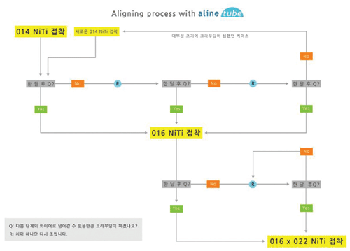 Bracket-free Orthodontics(BFO)에서의 배열 과정을 도표로 정리해 보았습니다.(그림46) 일반적으로 014 나이타이로 시작하는 경우가 많지만 어린아이나 통증에 민감한 성인 그리고 크라우딩이 심한경우에는 012 나이타이부터 배열을 시작하기도 합니다. 와이어를 접착하고 한 달 후에 다음 단계의 와이어로 넘어갈 수 있을 정도로 크라우딩이 펴졌는지를 판단하게 됩니다.