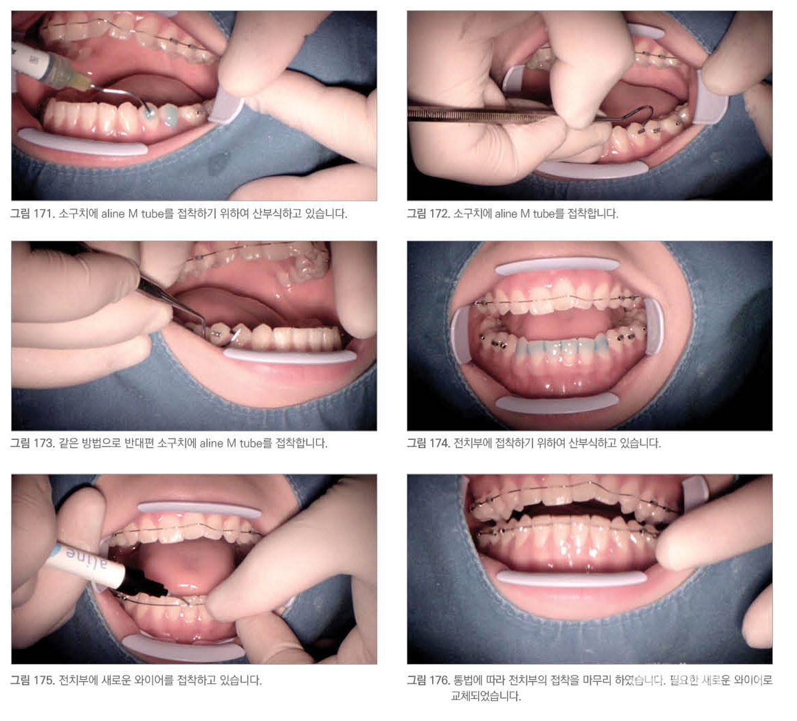 5. 소구치의 로테이션이 해결되어 정확한 위치에 접착이 가능해졌다고 판단되면 aline M tube를 접착합니다.(그림 171 ~ 173) 아직 회전이 해결되지 않았다면 접착을 미루는 것이 바람직합니다.(그림 1. 그림 150 참조)