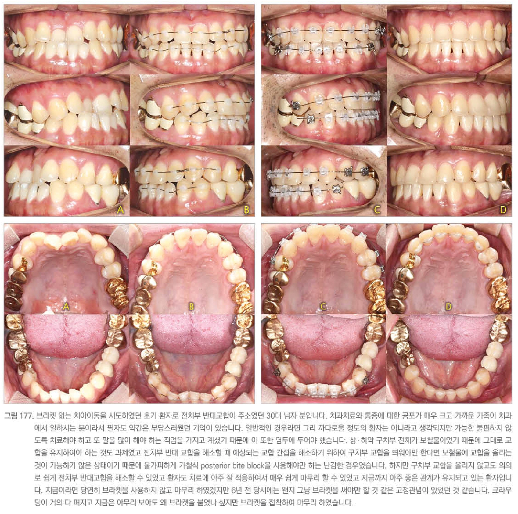 교정을 하는 치과의사라면 누구라도 그러하겠지만 저는 지난 20년 이상 브라켓을 정확하게 붙이려고 많은 노력을 기울여 왔습니다. 브라켓을 아주 정확하게 붙일 수만 있다면 와이어만 굵은 것으로 교체만 해주어도 교합을 딱 맞추어서 끝낼 수 있다고 생각했기 때문입니다. 가끔은 그런 기쁜 일도 있었지만 지속, 반복, 계획적으로 그런 일이 생기기 어렵다는 것을 이제서야 깨달았습니다. 그럼에도 불구하고 브라켓을 사용한다면 브라켓의 포지셔닝은 매우 중요합니다. 저는 처음에 부분교정부터 브라켓을 사용하지 않는 치료를 시도하였고 왠지 모를 불안감에 그냥 별 이유도 없이 브라켓을 붙이고 나서야 마무리 하였던 기억도 있습니다.(그림 177)