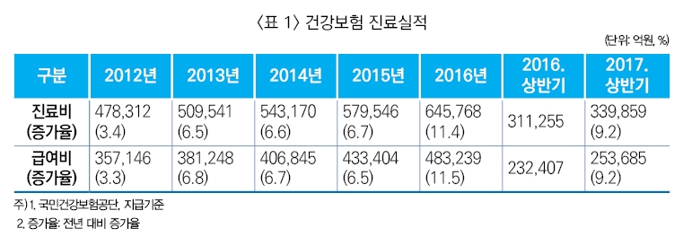 건강보험 진료실적을 보면, 2017년 상반기 진료비는 33조 9,859억 원으로 전년 대비 2조 8,604억원 증가해 9.2%의 증가율을 나타냈다. 이에 따라 공단이 요양기관에 지급하는 급여비(공단부담금)도 전년보다 2조1,278억원 증가한 25조 3,685억 원으로 전년 동기대비 9.2%증가했다. <표 1>