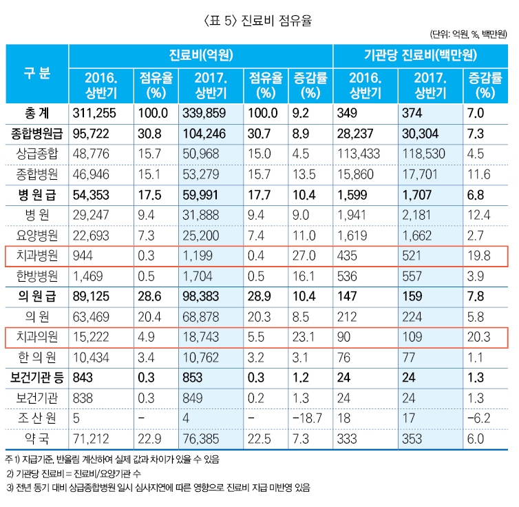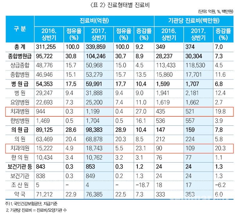 진료형태별 진료비 증가율은 외래 9.9%, 입원 9.5%, 약국 7.3% 순으로 증가했다. 기관 종별 진료비 증가율은 치과병원 27.0%, 치과의원 23.1%, 한방병원 16.1% 순이며, 진료비를 요양기관 수로 나눈 기관 당 진료비 증가율은 치과의원 20.3%, 치과병원 19.8%, 병원 12.4% 순으로 나타났다. <표 2>