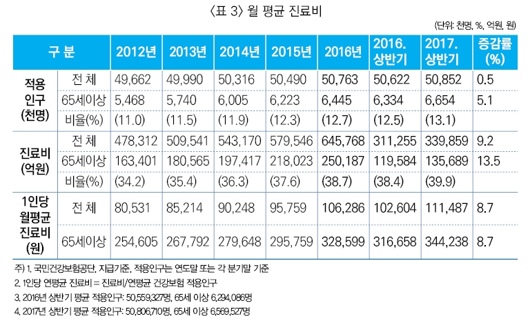 65세 이상 1인당 월평균 진료비를 보면, 65세 이상 적용인구는 665만 명으로 65세 이상 인구 비율이 13.1%로 2016년 말 대비 0.4%p 증가했다. 65세 이상 총 진료비는 13조 5,689억원으로 전체의 39.9%를 차지해 전년동기 대비 1.5%p 증가했으며, 1인당 월평균진료비는 344,238원으로 전년동기 대비 27,580원 증가했다.<표 3>
