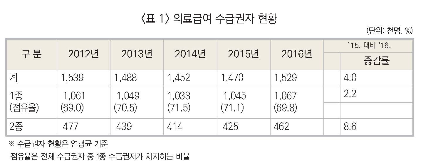 의료급여 통계연보에 따르면, 지난 2016년 의료급여 수급권자는 1,529천명으로 전년대비 4.0% 증가했다. 1종 수급권자는 1,067천명으로 전년대비 2.2% 상승해 전체 수급권자의 69.8% 를 차지했다. 2종 수급권자는 462천명으로 전년대비 8.6% 상승했다. <표 1>