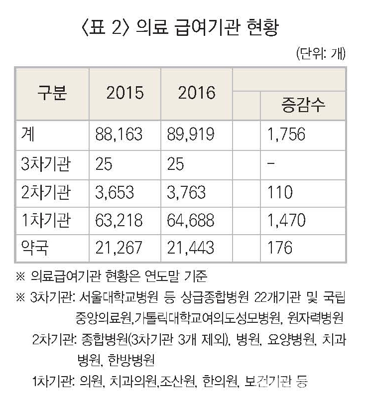 2차 기관은 요양병원 56개, 병원 18개 기관 증가했다. <표 2> 의료급여 심사실적 현황을 보면, 2016 년 심사 진료비는 6조 7,479억원으로 전년 대비12.7% 상승했다.