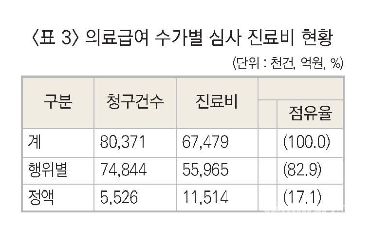 행위별수가는 5조 5,965억원으로 전체의 82.9%를 차지했다. 정액수가는 1조 1,514억원으로 전체의 17.1%를 차지했다. < 표 3>