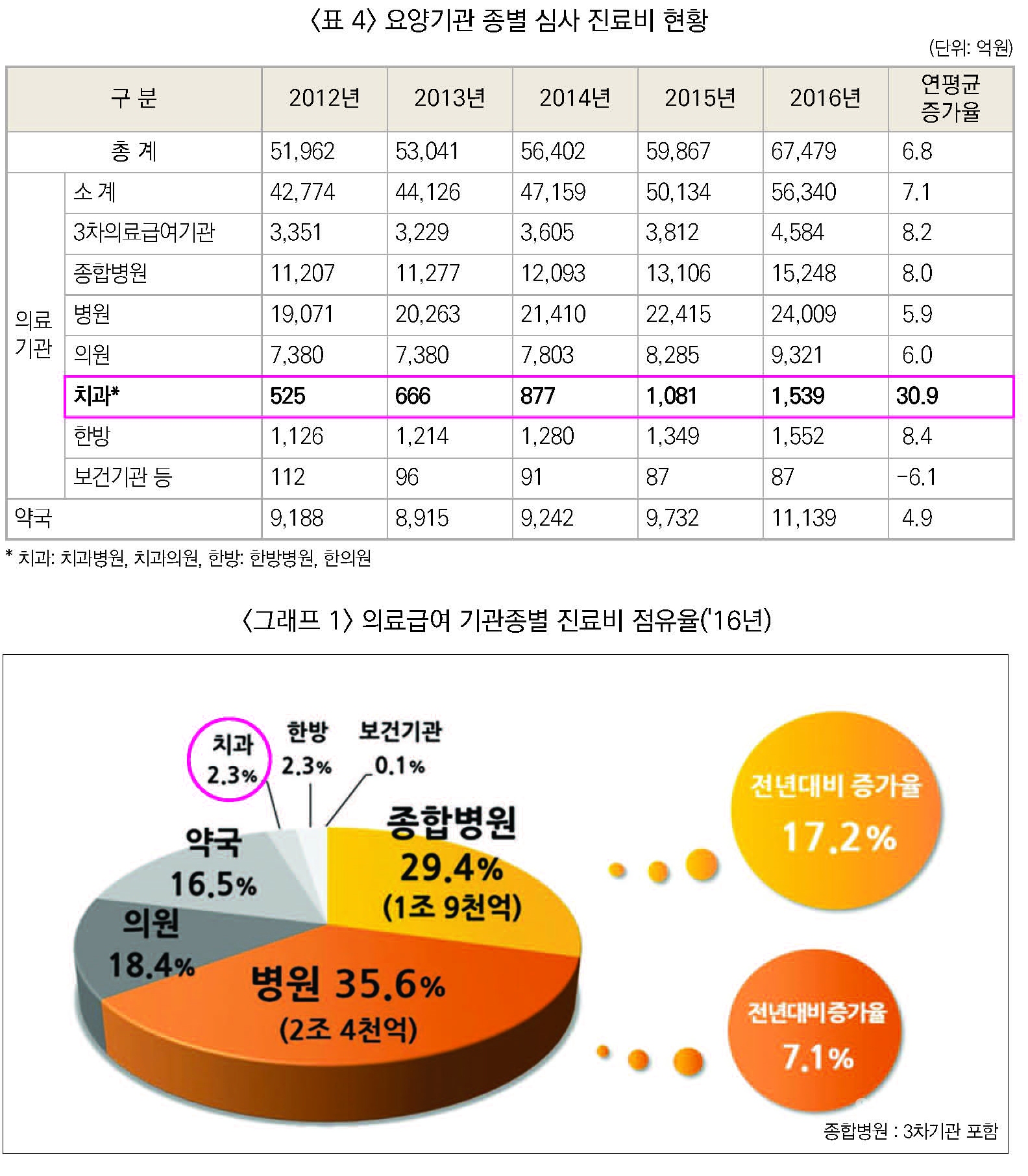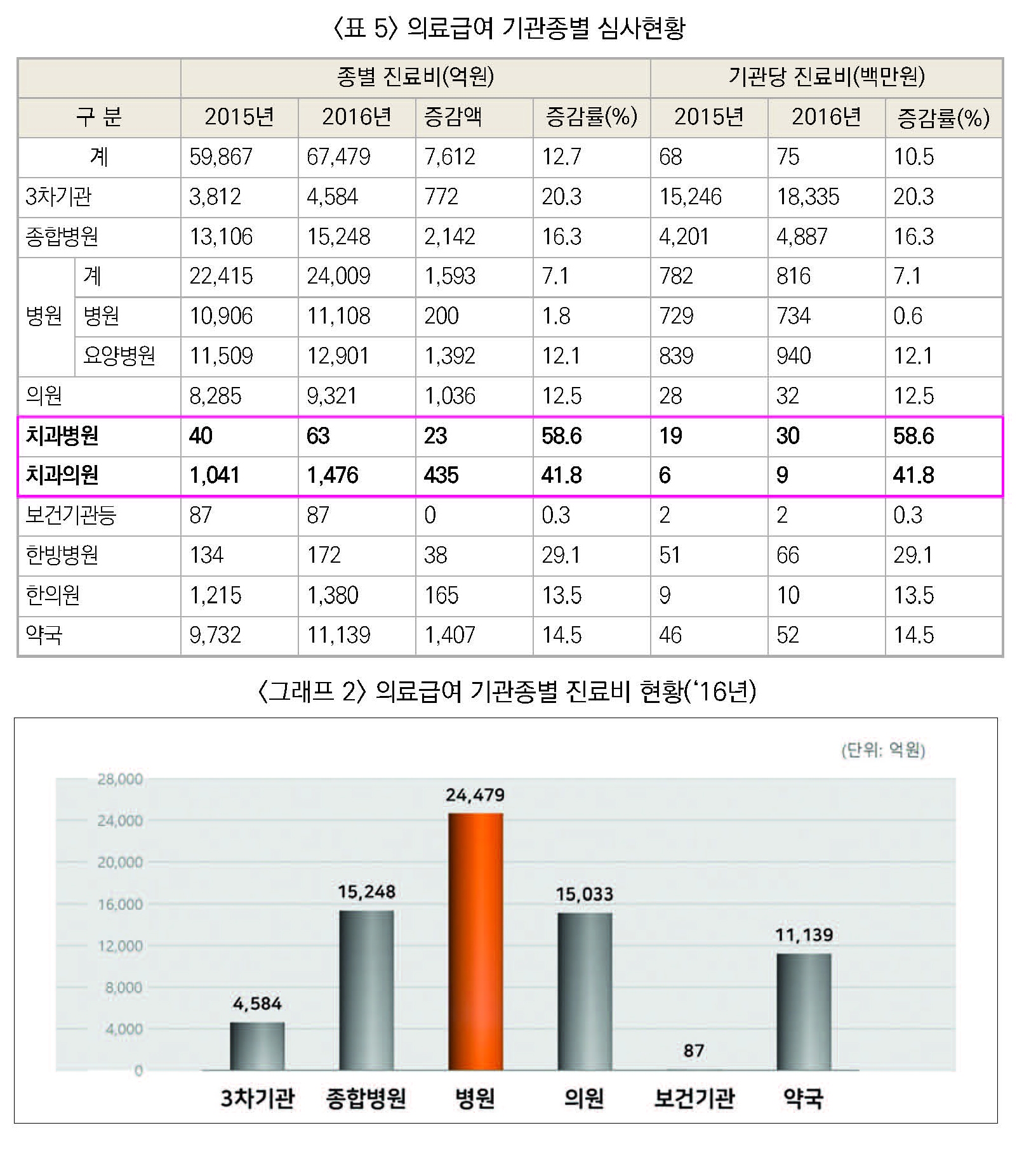 중증질환 급여비는 5,449억원, 희귀질환 6,019억원으로 전년대비 각 19.9%, 11.0% 각각 증가했다. 치아및 지지구조의 기타장애 급여비는 1,252억원으로 전년대비 41.9% 증가했다. <표 6>