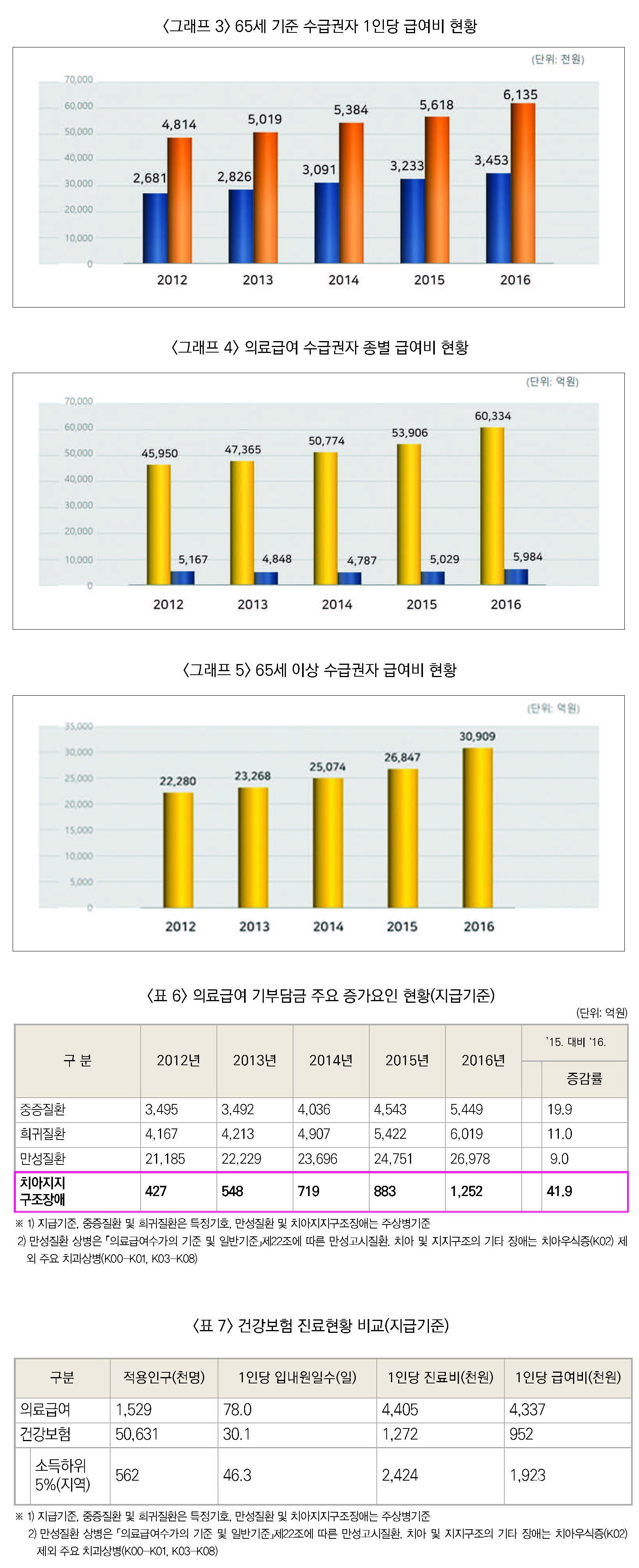 65세 이상 1인당 입내원일수는 103.8일로, 65세 미만 65.3일의 1.59배에 달한다. 2016년 1인당 의료급여비는 4,337천원으로 전년 대비 8.2% 증가했다.