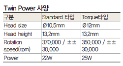 Twin Power는 독창적인 기술의 ‘트윈 임펠러’ 구조로 강력한 파워를 제공하는데, 3개의 노즐을 통한 Drive Air는 1차 임펠러를 회전시키고, Air 유도판에 의해 2차 임펠러를 회전시킴으로 일정하게 제어된 속도로 보다 강력한 토크를 발생시켜, 어떠한 조건에서도 안정적인 시술 결과를 얻을 수 있다.