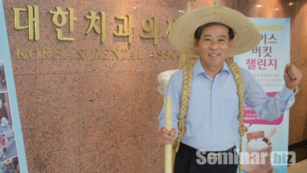 대한치과의사협회 최남섭 회장이 지난 21일 성동구 치과의사회관 로비에서 쌀 20Kg을 들어 올리며 '라이스버킷 챌린지'에 동참했다.
