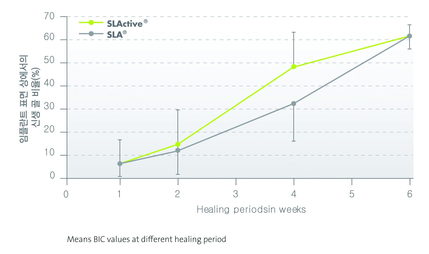 <표1>의 그래프는 SLActive®와 SLA®를 비교한 골유착 과정이다. SLA®표면 임플란트와 SLActive®표면 임플란트 두 가지 모두 유사한 치유 양상이 관찰됐으나, SLActive®표면 임플란트가 시술 2주 후 골-임플란트 접촉비율(BIC)이 더 높았고, 4주 후 이후엔 그 차이가 더 벌여졌음을 확인할 수 있다.