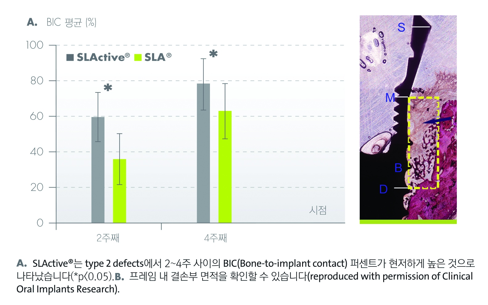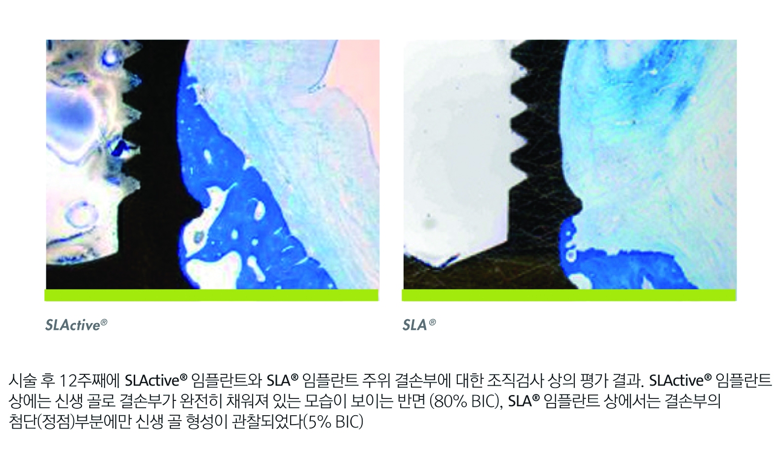 골 결손이 있는 경우, 골유착에 대한 예측가능성이 크게 떨어질 수 있다. 최근 한 전임상시험결과에 따르면 SLActive® 표면은 8주 이내 신생골 응집체의 생성률이 더 높은 것으로 나타났다.