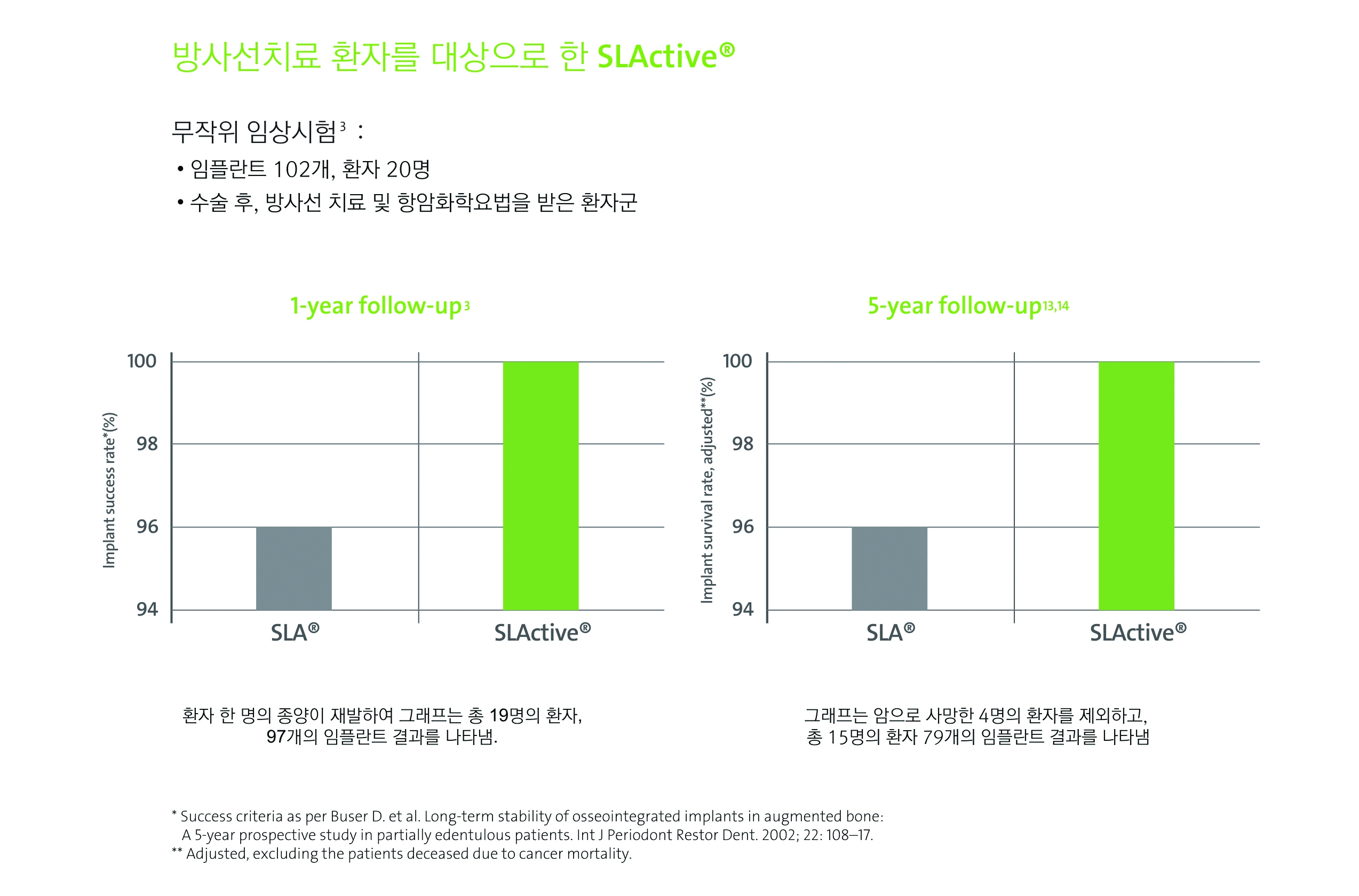당뇨 환자군과 비 당뇨 환자군 간 SLActive® 성능을 비교한 임상시험에서 당뇨 환자군에서도 건강한 대조군과 유사한 골 변화를 관찰할 수 있었다. 또한 당뇨 환자군에서의 SLActive® 임플란트 치료 성공률은 100%였다. 또한 방사선 치료 환자를 대상으로 한 무작위 임상시험에서도 100%의 치료 성공률을 기록했다.