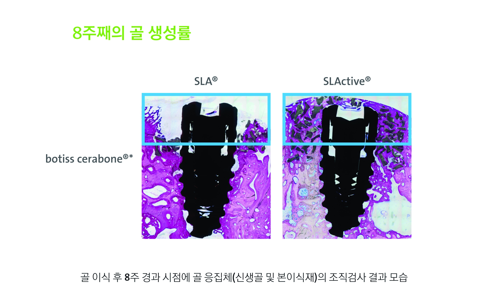 SLActive®를 사용한 결과 빠른 골유착의 핵심 요소인 신생골 높이와 골 충전과 골-임플란트 접촉 비율이 매우 높아졌다.