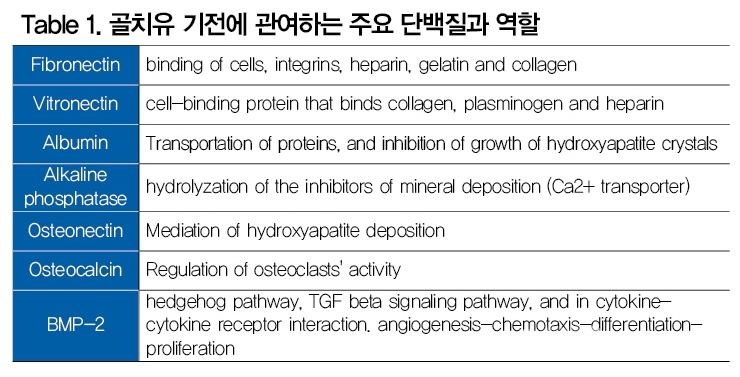 분자 생물학에서 이루어진 최근의 발전과 함께 치유 과정의 특정 단계 동안 다양한 신호분자의 동정이 가능해졌다. 이러한 골치유 기전에 대표적인 역할을 하는 단백질 펩타이드 계열에는 BMP-2, Fibronectin, Vitronectin 등이 있을 수 있다(Table 1).