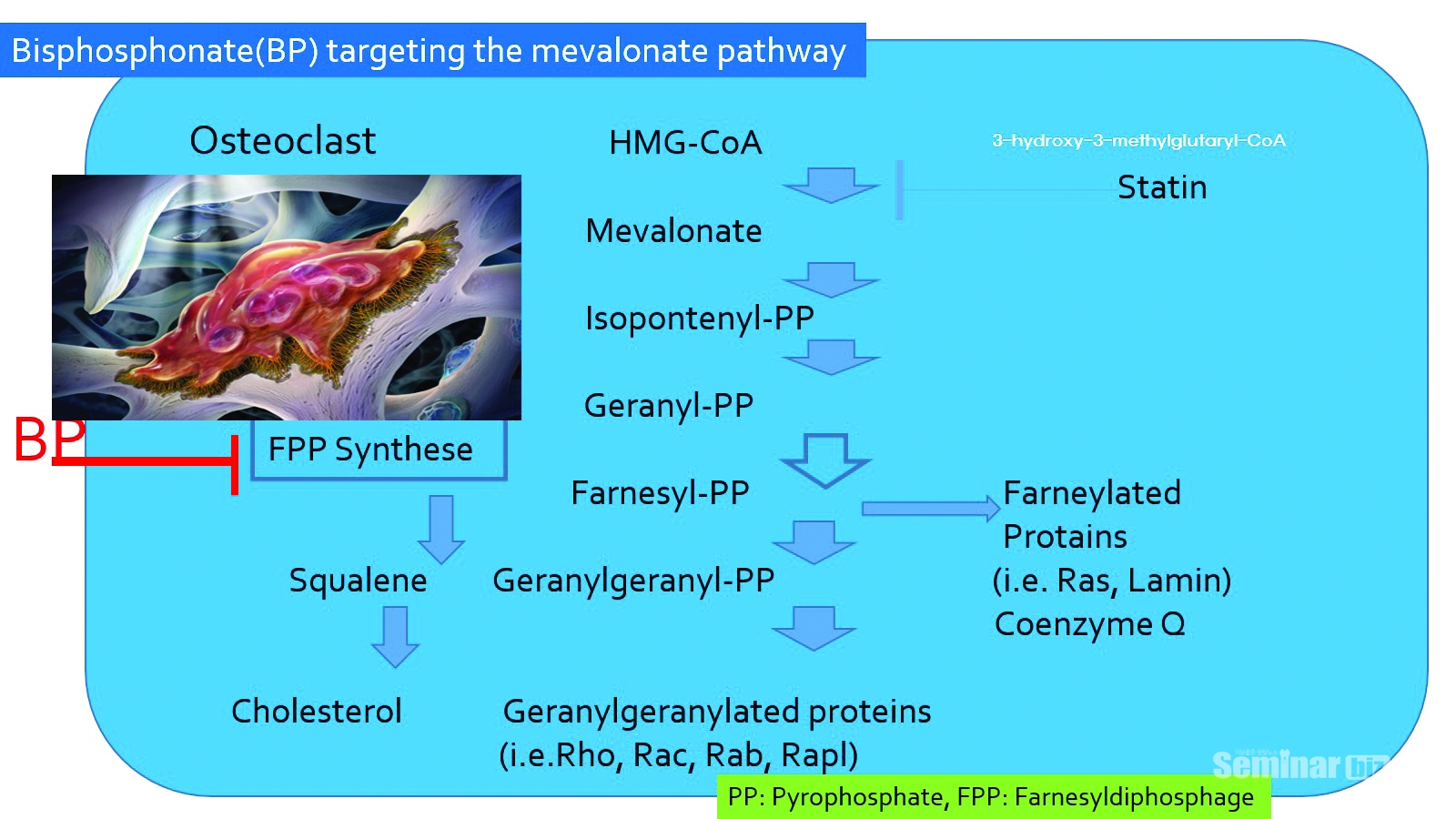 Aminobisphosp honate는 추가적으로 콜레스테롤 합성의 mevalonate pathway의 일수송, 세포골격, 세포 분화의 조절실패를 야기하고 최종적으로 파골세포의 기능 억제를 유도한다.