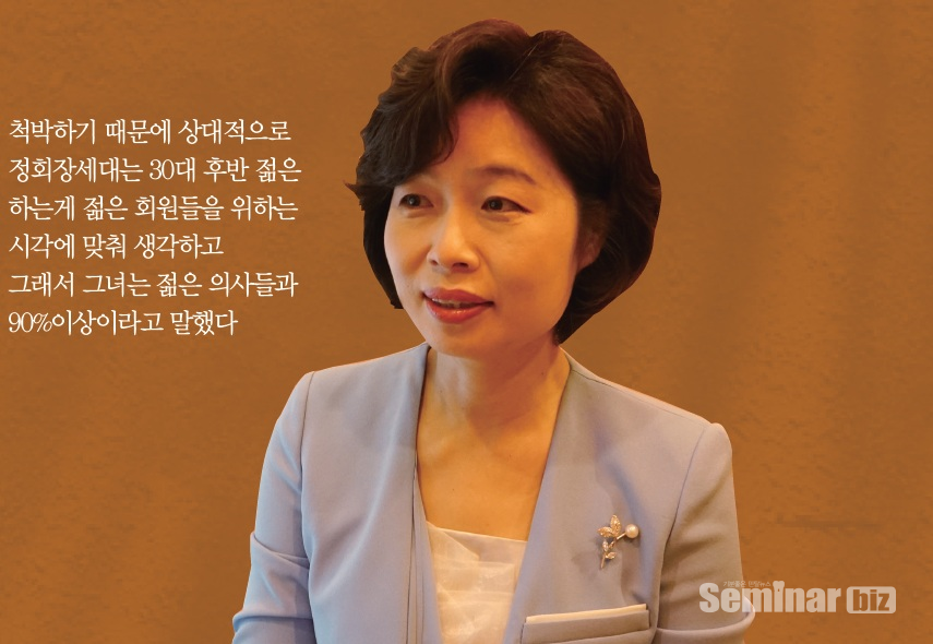 지금 개원환경은 척박하기 때문에 상대적으로 개원환경이 좋았던 정회장세대는 30대 후반 젊은 의사들을 위해 봉사하는게 젊은 회원들을 위하는 길이며, 젊은 회원들의 시각에 맞춰 생각하고 일하려고 하고 있다. 그래서 그녀는 젊은 의사들과 생각하는 싱크로율 90%이상이라고 말했다.