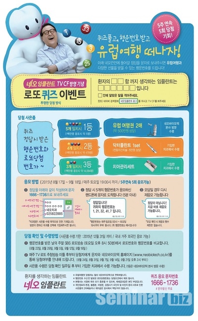 TV CF방영을 통해 네오임플란트로 고객에게 이름을 알린 네오는 8월 17일부터 시작하여 내달 18일까지 한 달간 ‘로또 퀴즈이벤트’를 진행한다. 국내에 거주하는 내국인, 외국인 구분 없이 이벤트 응모가 가능한데 반드시 네오임플란트를 시술받는 치과에서 응모해야 한다.