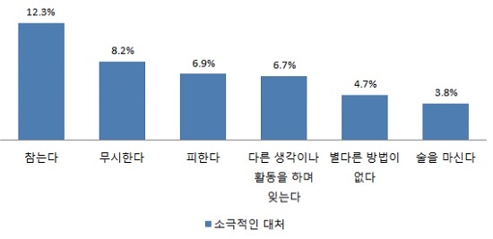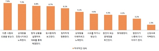 언어폭력의 유형에는 ‘반말을 한다’가 21.6%, ‘큰소리 지른다’ 16.3%, ‘비아냥거리는 말을 한다’가 11.3%를 차지했다. 언어폭력을 경험했을 때 대처하는 방식은 소극적이었다. ‘참는다’가 12.3%, ‘무시한다’ 8.2%로 나타났다.