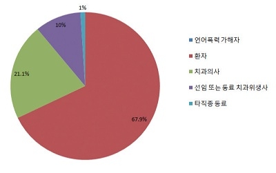 연구결과 치과위생사들의 57%가 최근 1개월 이내에 치과에서 언어폭력을 경험했다. 언어폭력의 주된 가해자는 환자(67.95)인 것으로 나타났다. 이어 치과의사(21.1%), 치과위생사(10.0%), 기타 직원(1.0%) 순이었다.