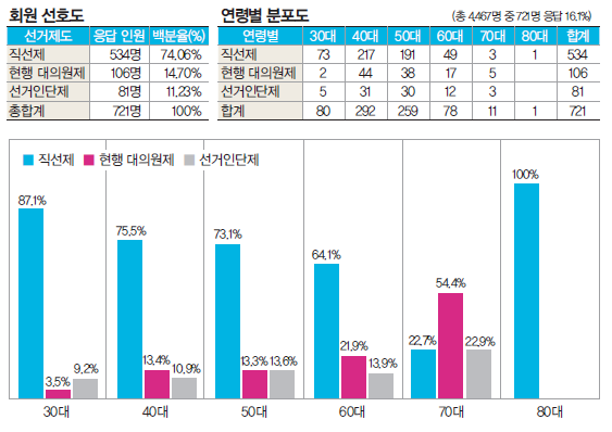 그 결과 응답자의 74.06%(534명)가 직선제를 지지했으며 △현행 대의원제 14.70%(106명) △선거인단제 도입 11.23%(81명) 순으로 나타났다.